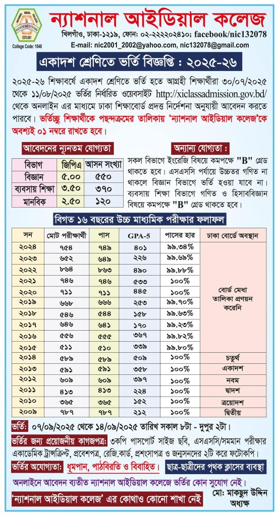 মানুষ জন্ম থেকে মৃত্যু পর্যন্ত শেখে। এ শিক্ষা কখনো আত্ম উপলব্ধিজাত, কখনো পর্যবেক্ষণগত অভিজ্ঞতা, কখনোবা প্রাতিষ্ঠানিক। প্রাতিষ্ঠানিক শিক্ষাই মানুষের জীবনে ব্যাপক প্রভাব বিস্তার করে। প্রাতিষ্ঠানিক শিক্ষায় মূলত প্রাথমিক, মাধ্যমিক, উচ্চ মাধ্যমিক ও উচ্চ শিক্ষা প্রদান করার রীতি প্রচলিত। ন্যাশনাল আইডিয়াল কলেজ এ প্রচলিত রীতিতে মাধ্যমিক ও উচ্চ মাধ্যমিক স্তরের শিক্ষার্থীদের শিক্ষা প্রদান করে থাকে।